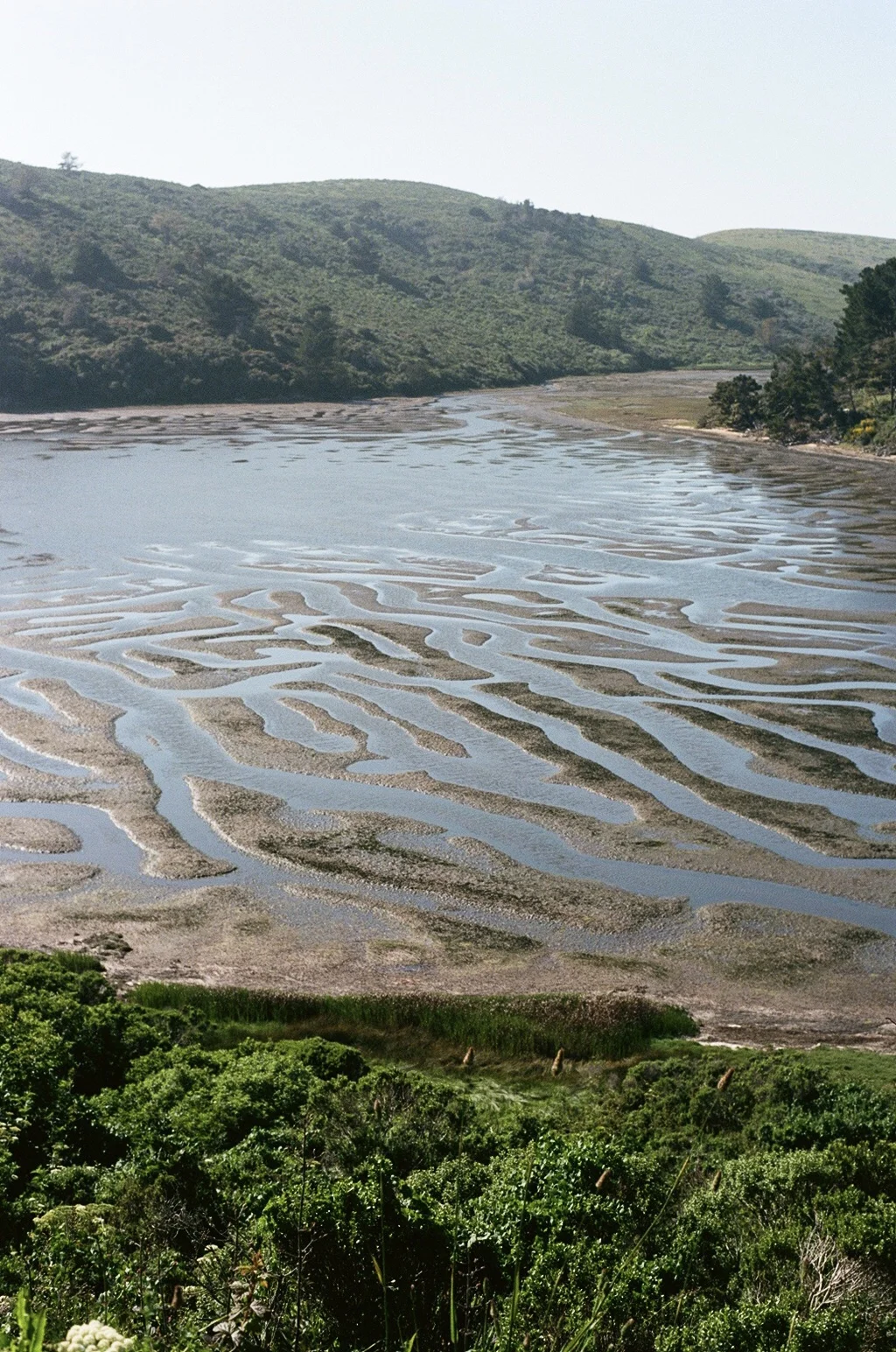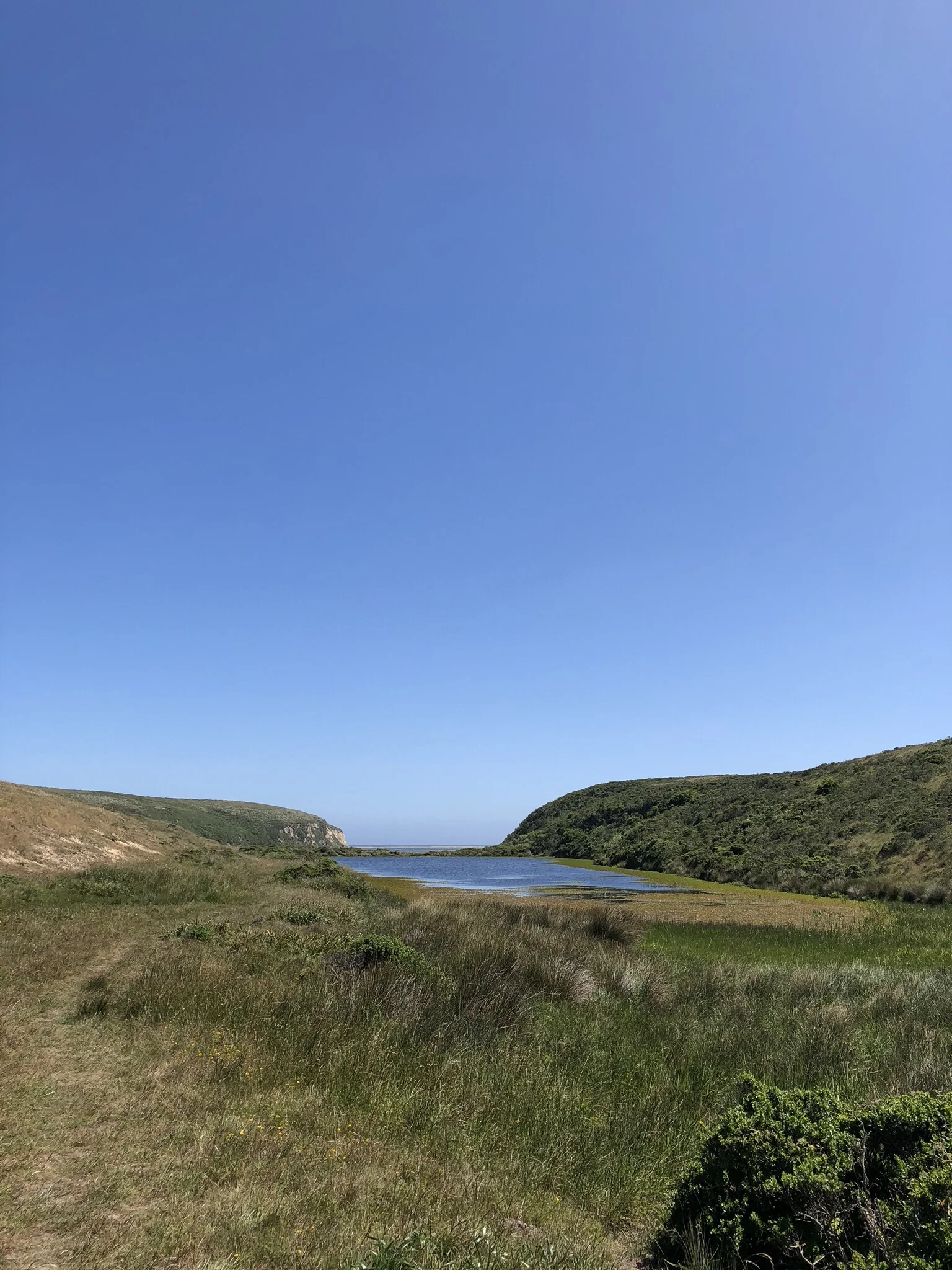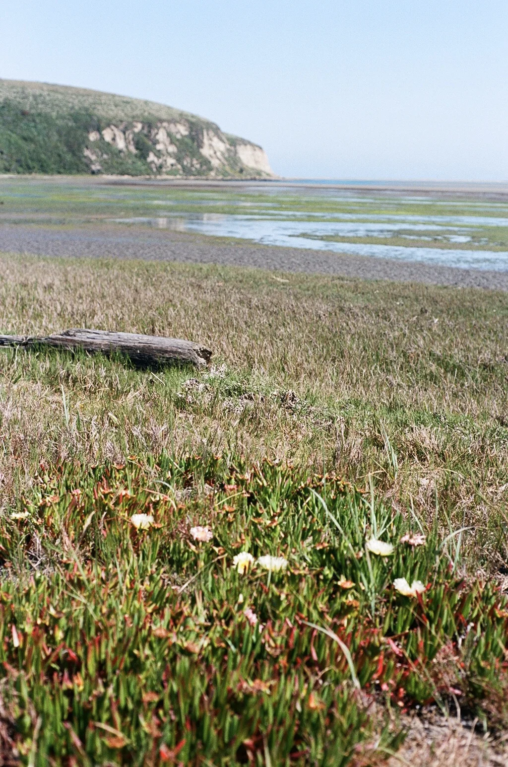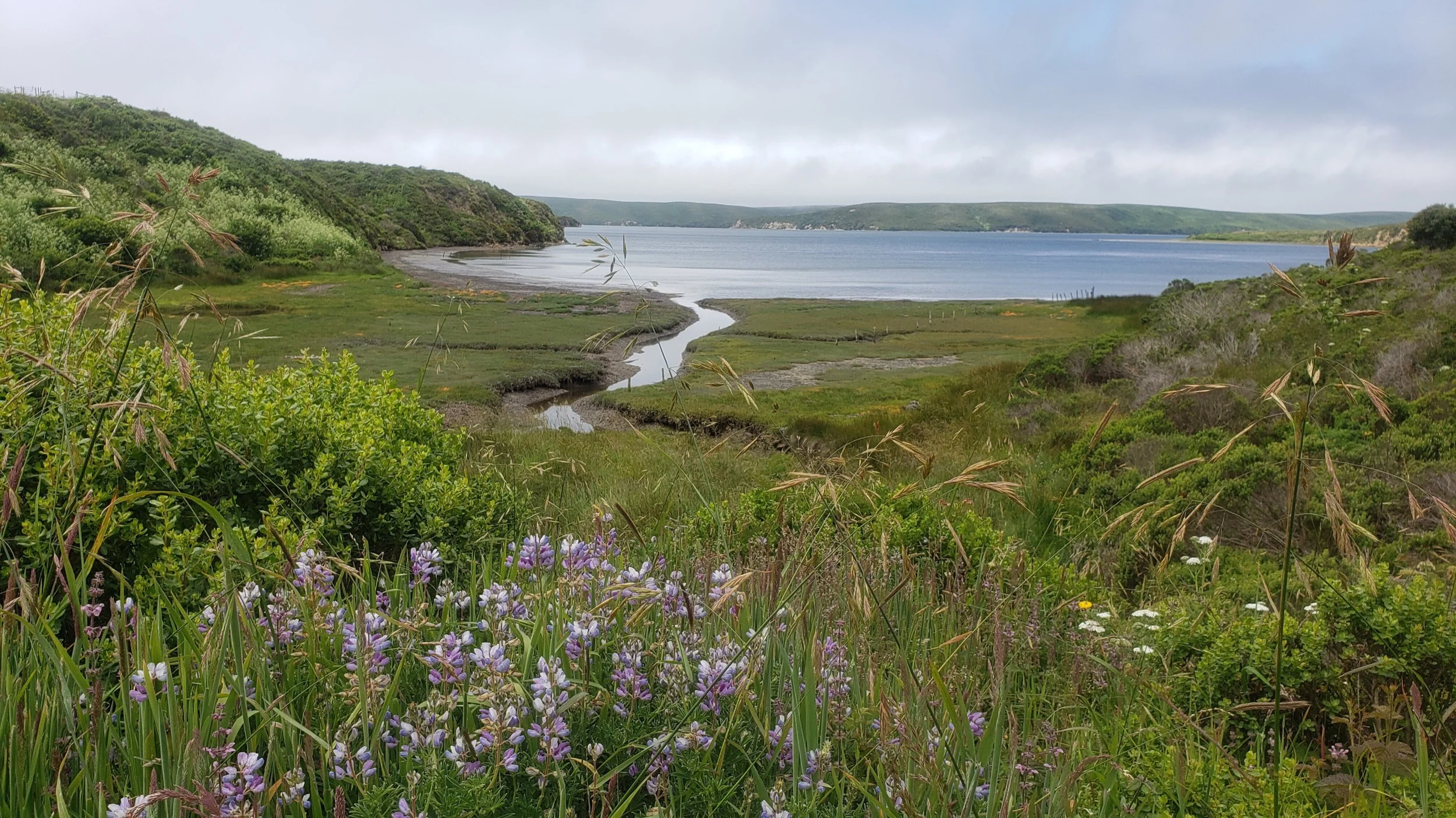One final climb brings you to the junction with the Sunset Beach Trail. You’ll head downhill and trek through grassland and pass a huge pond. Sunset Beach is just beyond this pond. Sunset Beach is not your typical sandy beach. It’s covered with “Ice Plants” and very muddy. It’s essentially an estuary mouth but the views of Limantour Spit, Drakes Beach, and the surrounding bluffs are wonderful. Plus, it’s super secluded. Rarely do I find more than a couple of hikers out here (if any).